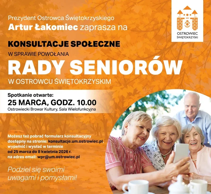 Władze miasta poinformowały o planowanych konsultacjach, które mają zebrać opinie i propozycje mieszkańców na temat powołania Rady Seniorów. Zgłoszone uwagi posłużą do opracowania projektu uchwały powołującej Radę Seniorów. Inicjatywę ogłosił Prezydent Miasta Ostrowca Świętokrzyskiego Artur Łakomiec.