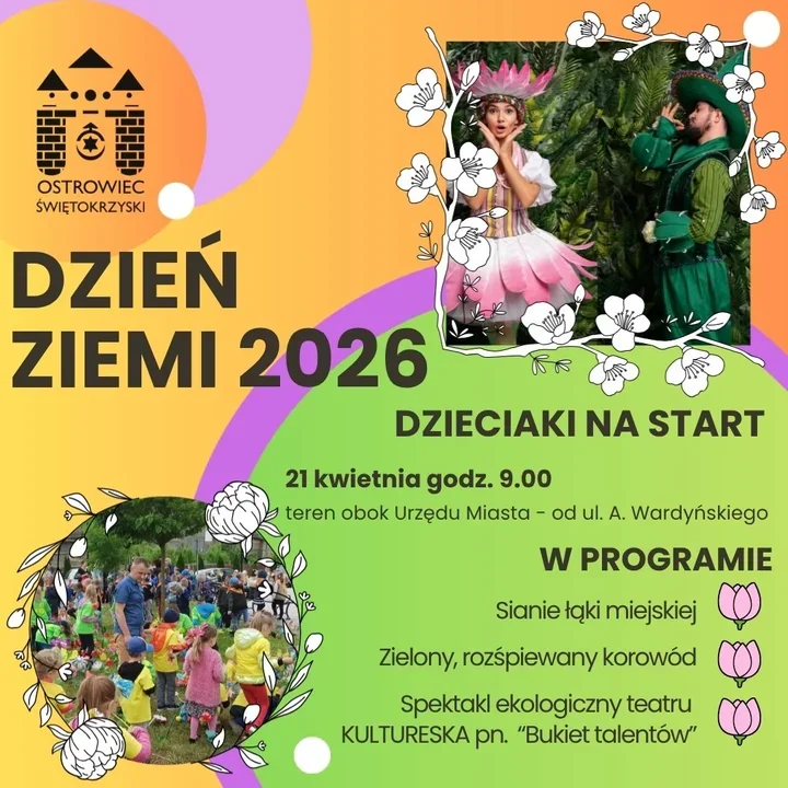 W Ostrowcu Świętokrzyskim Dzień Ziemi ma zacząć się od ruchu, koloru i wspólnego działania, a nie od szkolnej ławki. Dzieci w wieku przedszkolnym i najmłodsi uczniowie klas I wejdą w ten dzień wprost w teren – z nasionami, zielonymi dodatkami i piosenką. Najpierw pojawi się łąka miejska, potem korowód, a na końcu plenerowy spektakl, który ma uczyć ekologii bez zadęcia i bez nudy.